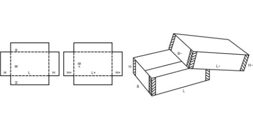 Krabicové přířezy jsou bez drážek, složené, s venkovními spojovacími záložkami se zakrytým šikmým rilováním. Každý díl je spojen čtyřbodovým lepením.