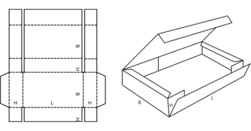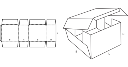 Jednodílná krabice s k sobě doléhájícími klopami délkových stěn, krátkými vnitřními a plně se překrývajícími dvojitými vnějšími klopami čelních stěn. (A/M)