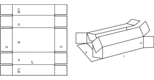 Jednodílná skládaná krabice s šířkovu stranou ve výšce, prodlouženými a překryvajícími se záložkami, stranovými záložkami na šířkových stranách a dvojitou délkovou stěnou. (A/M)