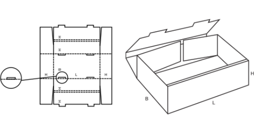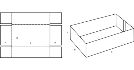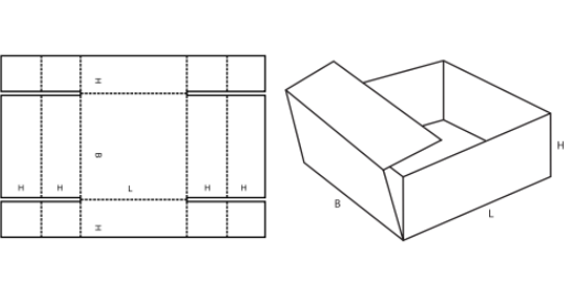 Otevřený díl (paletka) se spojovacími záložkami na délkových stěnách, krátkými vrchními délkovými klopami s aretací. Ve dně zaaretované klopy šířkových stran se zesilovacími záložkami. (M)
